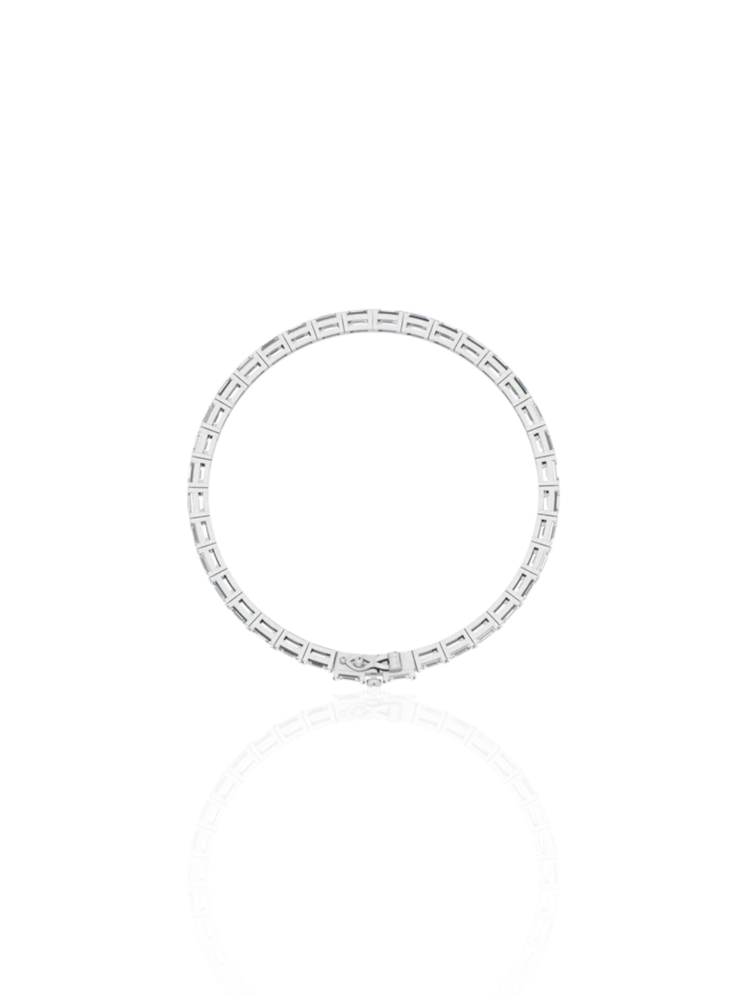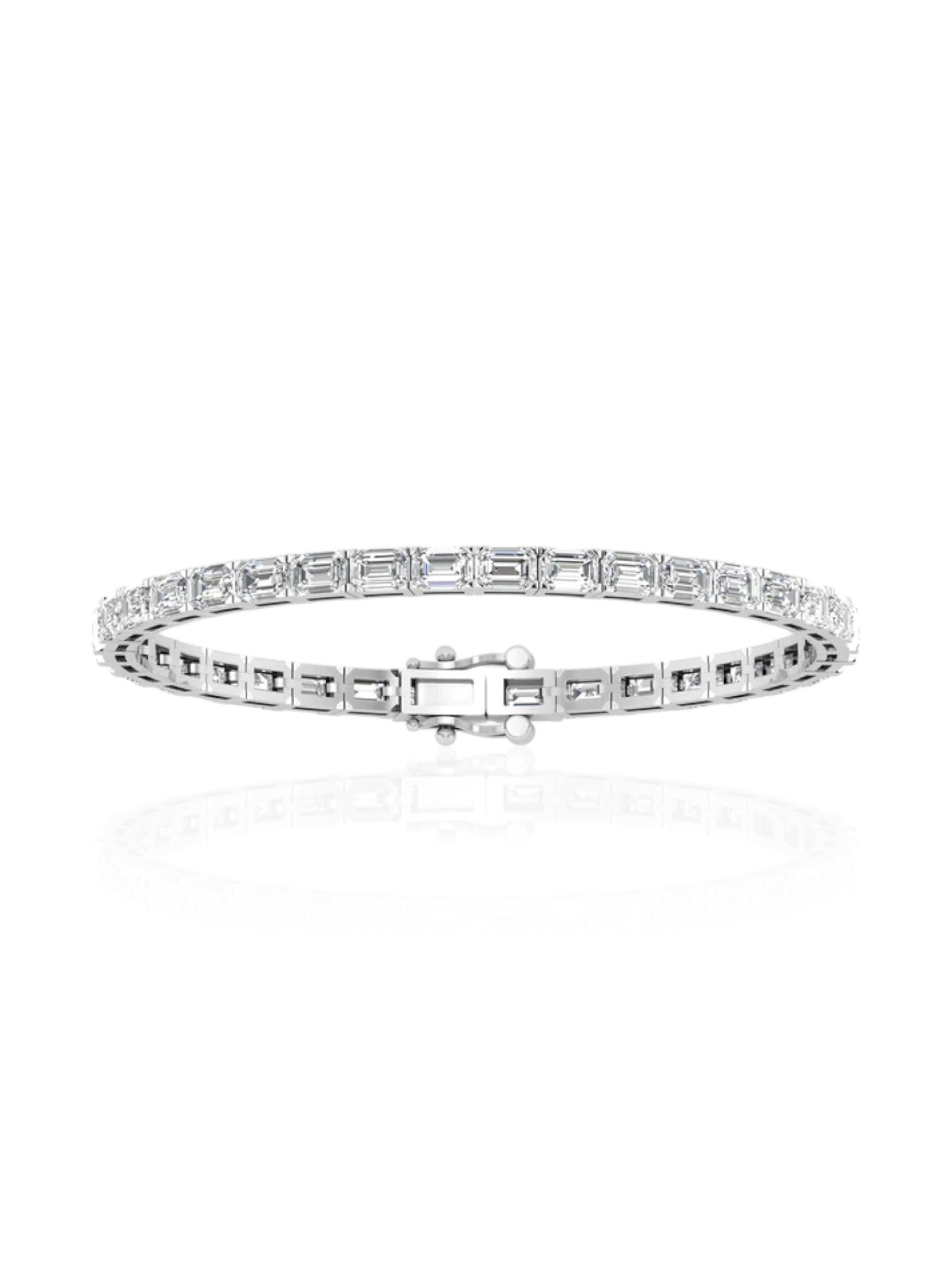 Hand-crafted in stunning 14K White Gold with a choice of either a 5 or 10.00ct Carat weight and a Gold weight of 11.30g, the Arya Emerald East West Bracelet is a true masterpiece, boasting exceptional details. Featuring 37 dazzling diamonds in the sophisticated Emerald shape, each with a flawless D-E average color and VS-VVS average clarity, this luxurious piece is available in the size of 7 inches.