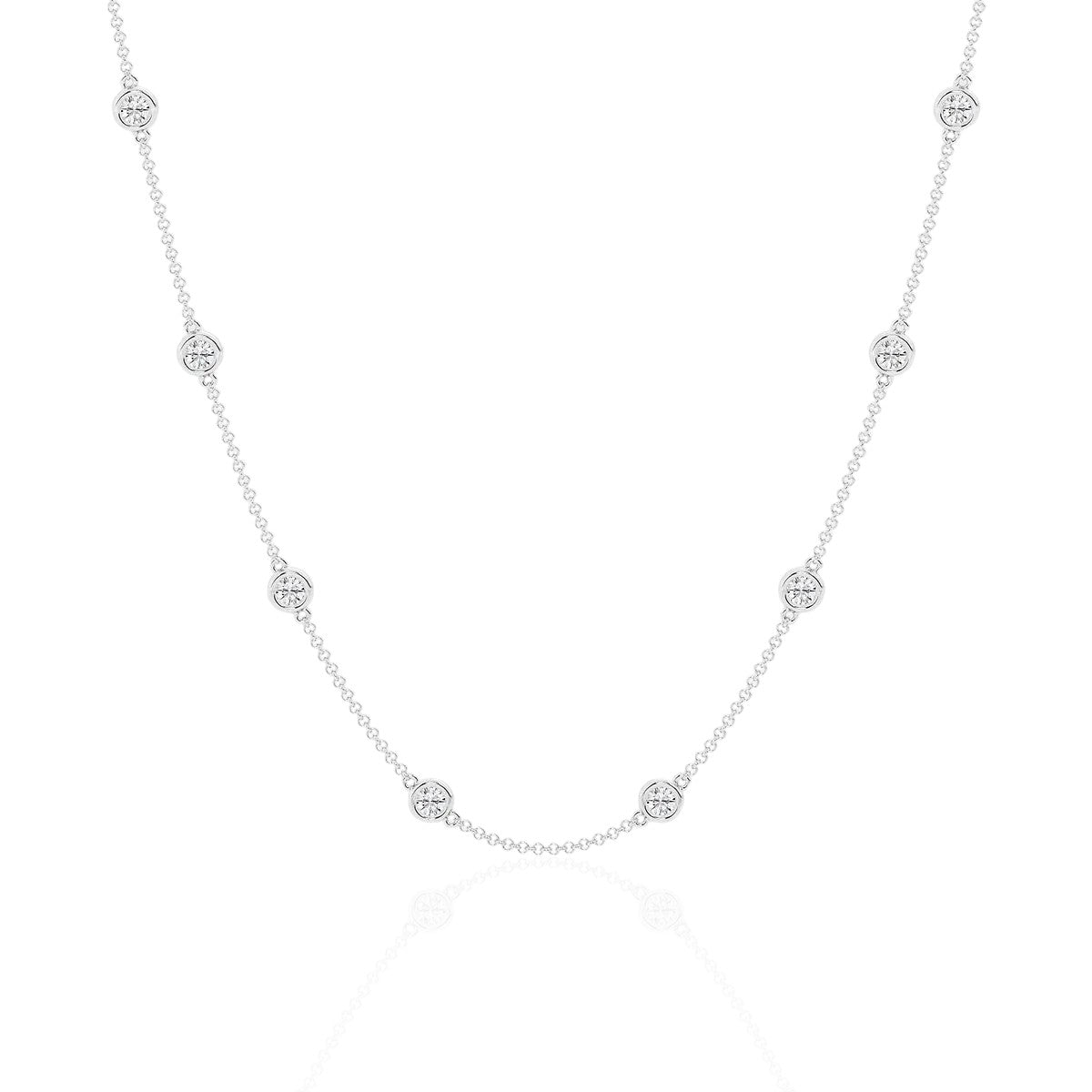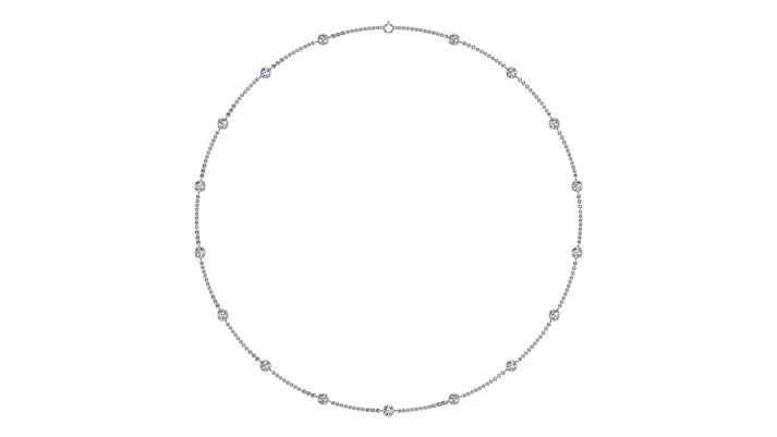 Enhance your wardrobe with the ultimate symbol of sophistication. The Ethereal Grace Necklace features a stunning 14K White Gold or 14k Yellow Gold, with your choice of 2.7 carats or 4.2 carats of diamond perfection. Each 18-inch necklace is adorned with 12 round diamonds, boasting a flawless D, E color and VS or higher clarity. Make a statement and experience the pinnacle of luxury with this diamond by the yard necklace.