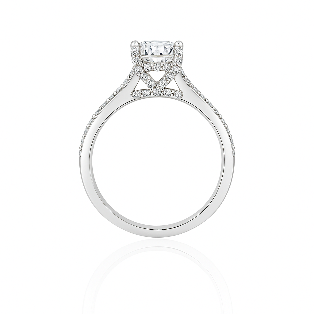 The Gia Engagement Ring setting showcases a channel design with diamonds set on the shoulders, bridge, under the halo, and prongs, all secured by a claw setting. The band holds approximately 0.30 to 0.50 carats of diamonds. Please note, diamonds are sold separately; the price reflects the setting only.