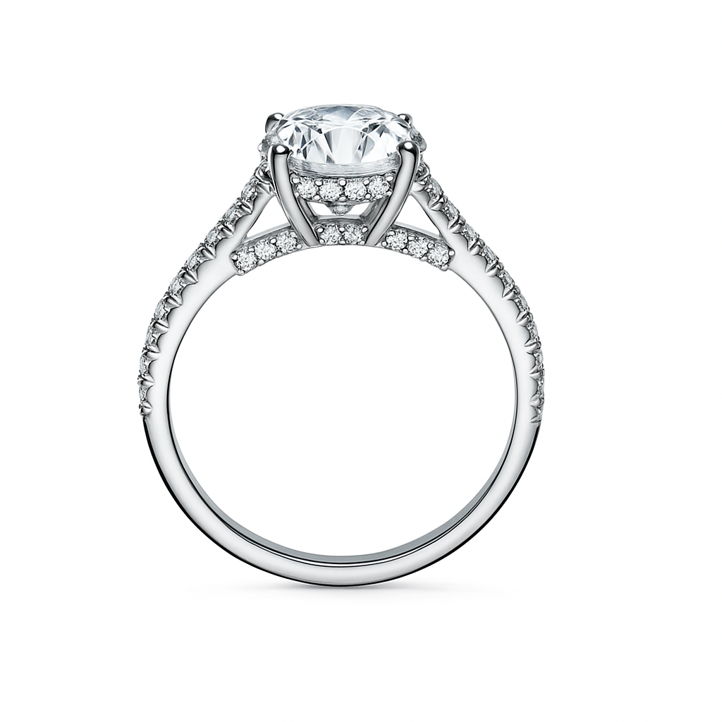 The Hera Engagement Setting (Setting Only) showcases an expertly crafted pavé band, meticulously set with diamonds that extend elegantly along the bridge and under the halo. This intricate detailing enhances the overall brilliance and sophistication of the setting, providing a luminous foundation designed to complement and elevate your chosen center stone. Perfect for those seeking a refined and timeless design with subtle yet striking diamond accents. in 18k white or yellow gold.