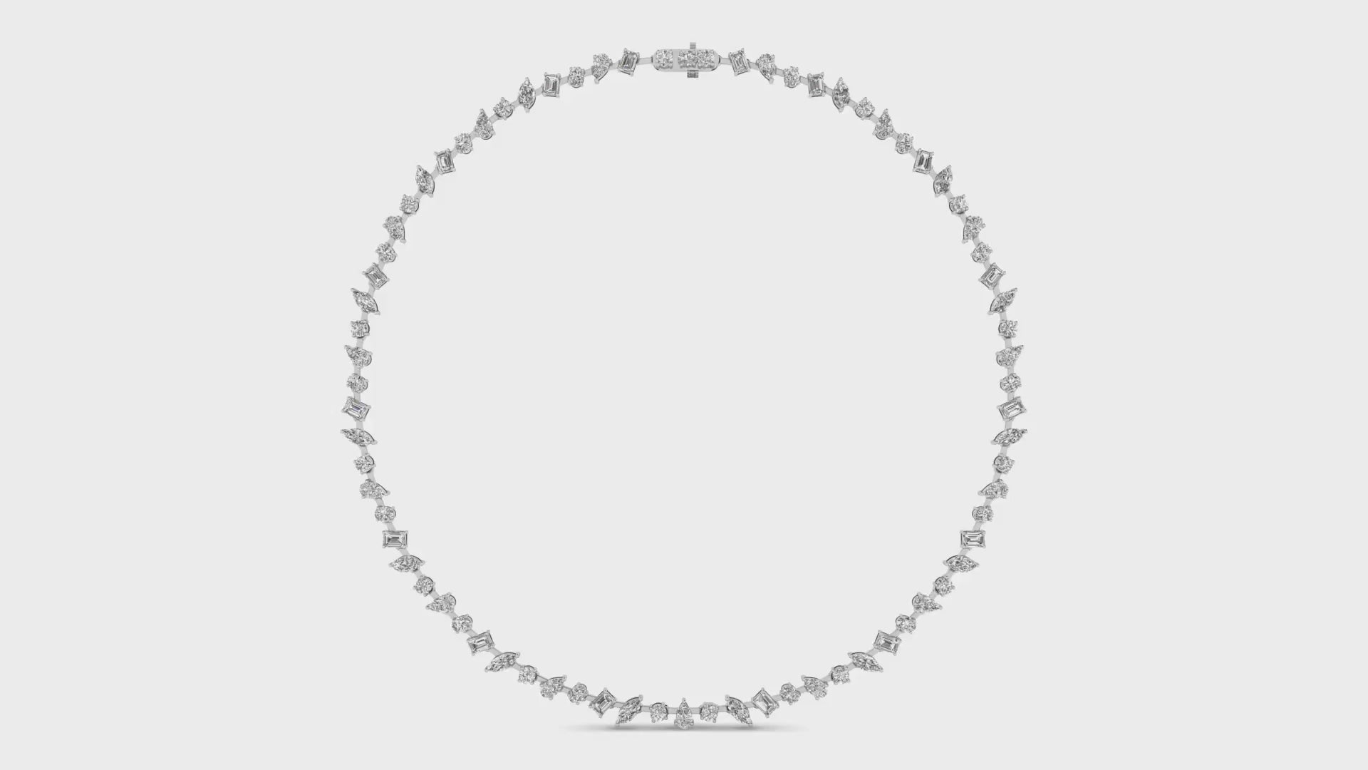 Indulge in luxury with our Artemis Multi Diamond Shape Necklace. Expertly crafted with 14K white gold and adorned with 73 exquisite diamonds in an elegant combination of pear, oval, emerald round, and marquise shapes. Each diamond boasts a brilliant average color of D-E and a stunning clarity of VS-VVS. With a carat weight of 12.86ct and a gold weight of 24.43g, this 17-inch necklace is the epitome of sophistication and exclusivity. Elevate your style with this unique and timeless piece.