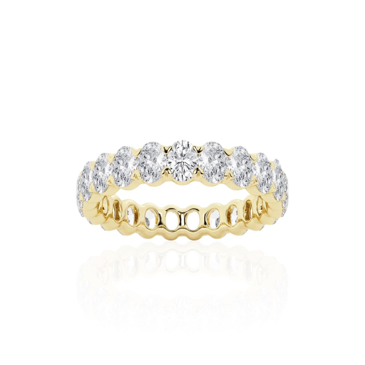 Discover our Oval Infinity Band in 14k Yellow Gold - the epitome of sophistication and luxury. Each diamond is handcrafted and carefully chosen for its top clarity and D or E color, enhancing the brilliance of this exquisite piece. Choose from 3, 4, or 5 carat total weight to elevate your style and make a statement. Immerse yourself in the opulent exclusivity of high-end jewelry.