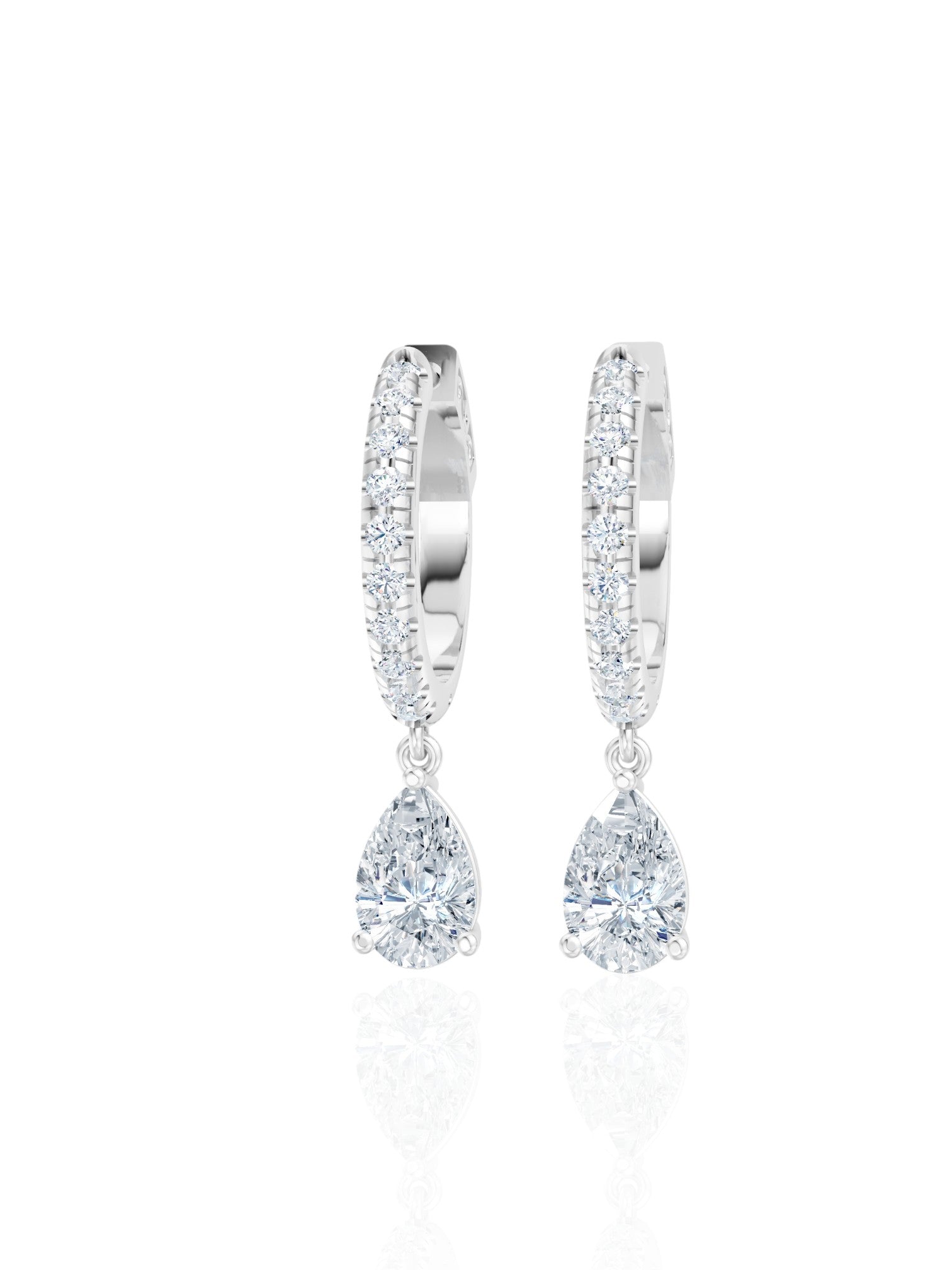 Indulge in elegance and classic charm with these Tear Drop Pear Hoop Earrings embedded in 14K White Gold. Enhanced with a stunning 2.5 carat of lab-grown diamonds and expertly crafted at 3.00 grams, these earrings exude refinement and exclusivity. Key Features: 34 diamonds in PEAR & ROUND cuts, with an average D-E color grade and VS-VVS clarity grade. Offered in 14k Yellow or 14k White gold options.