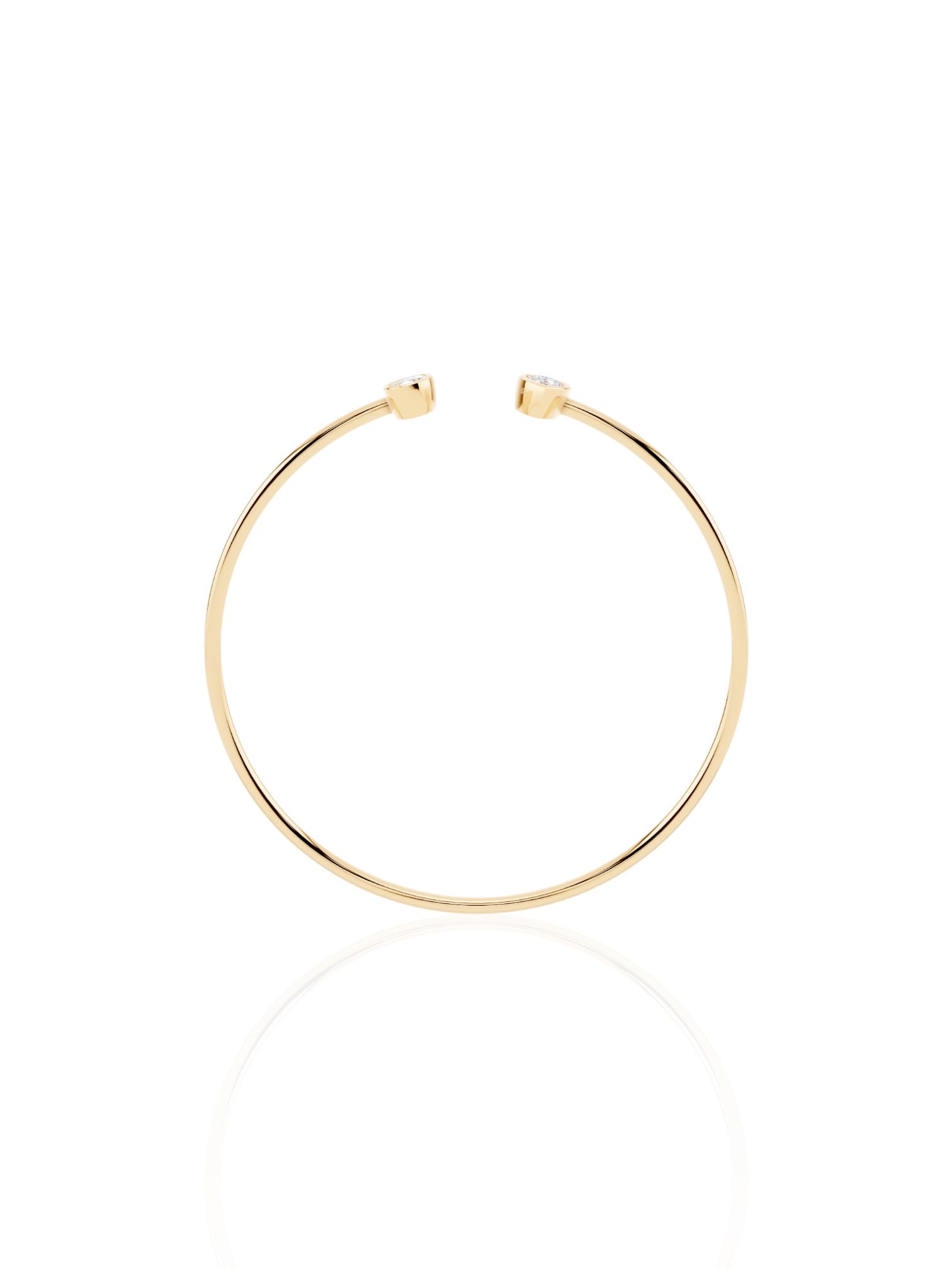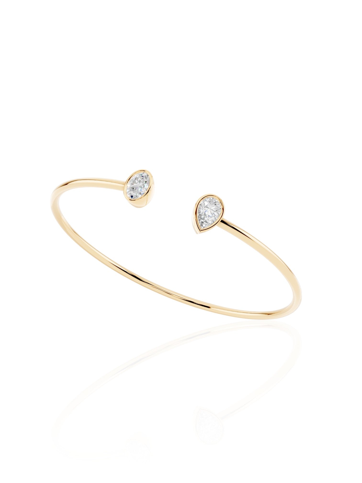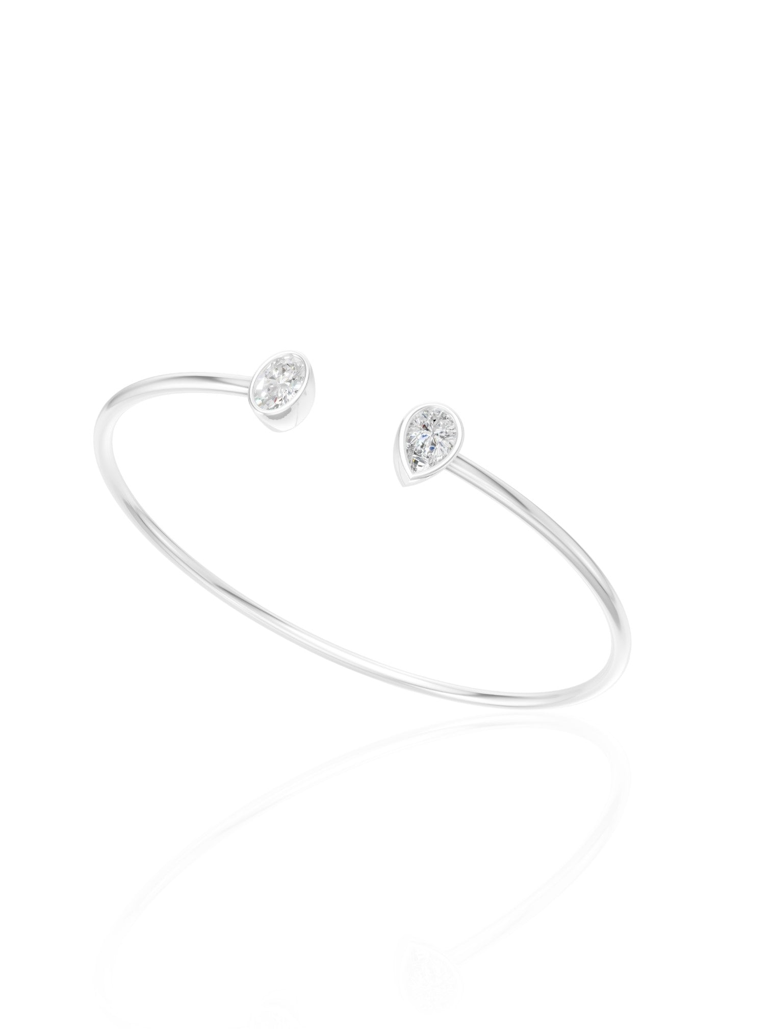 Enhance your fashion sense with the stunning Toi Et Moi Oval & Pear Bangle and exude a sense of opulence and elegance. Made of lavish 14k gold, it weighs approximately 6.55 GM and displays DE (colorless diamonds) with a clarity grading of VVS-VS. These diamonds are renowned for their exceptional clarity and brilliance, making this bangle a truly one-of-a-kind and exclusive piece. Elevate any outfit by choosing from the one or two carat total weight options available.
