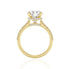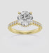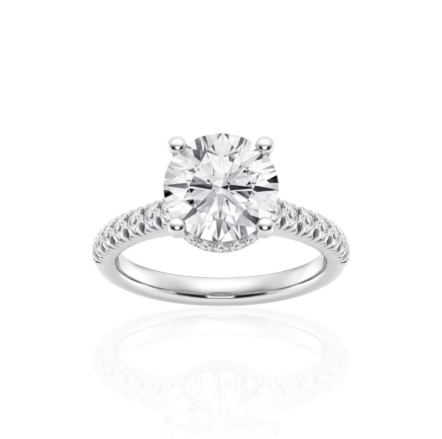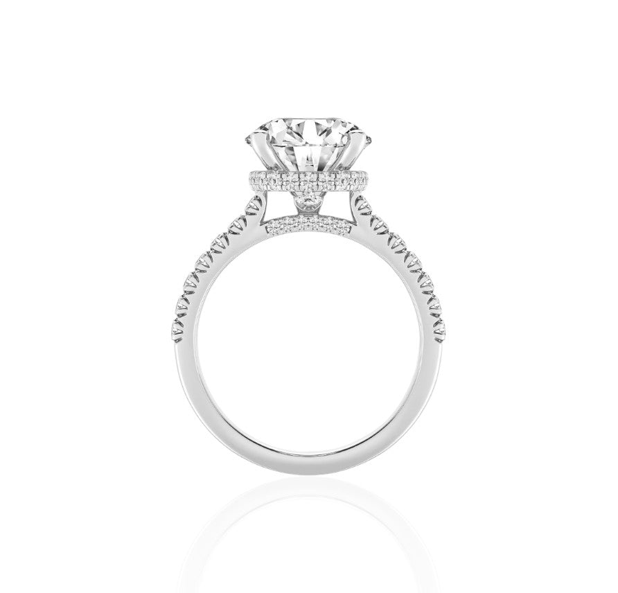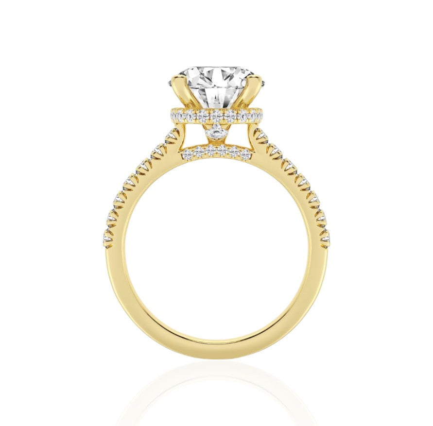 The Vera Engagement Ring setting showcases a refined design with an approximate 1.9 mm width beneath the halo and extending along the shoulders, providing a delicate yet sturdy framework for your center stone.